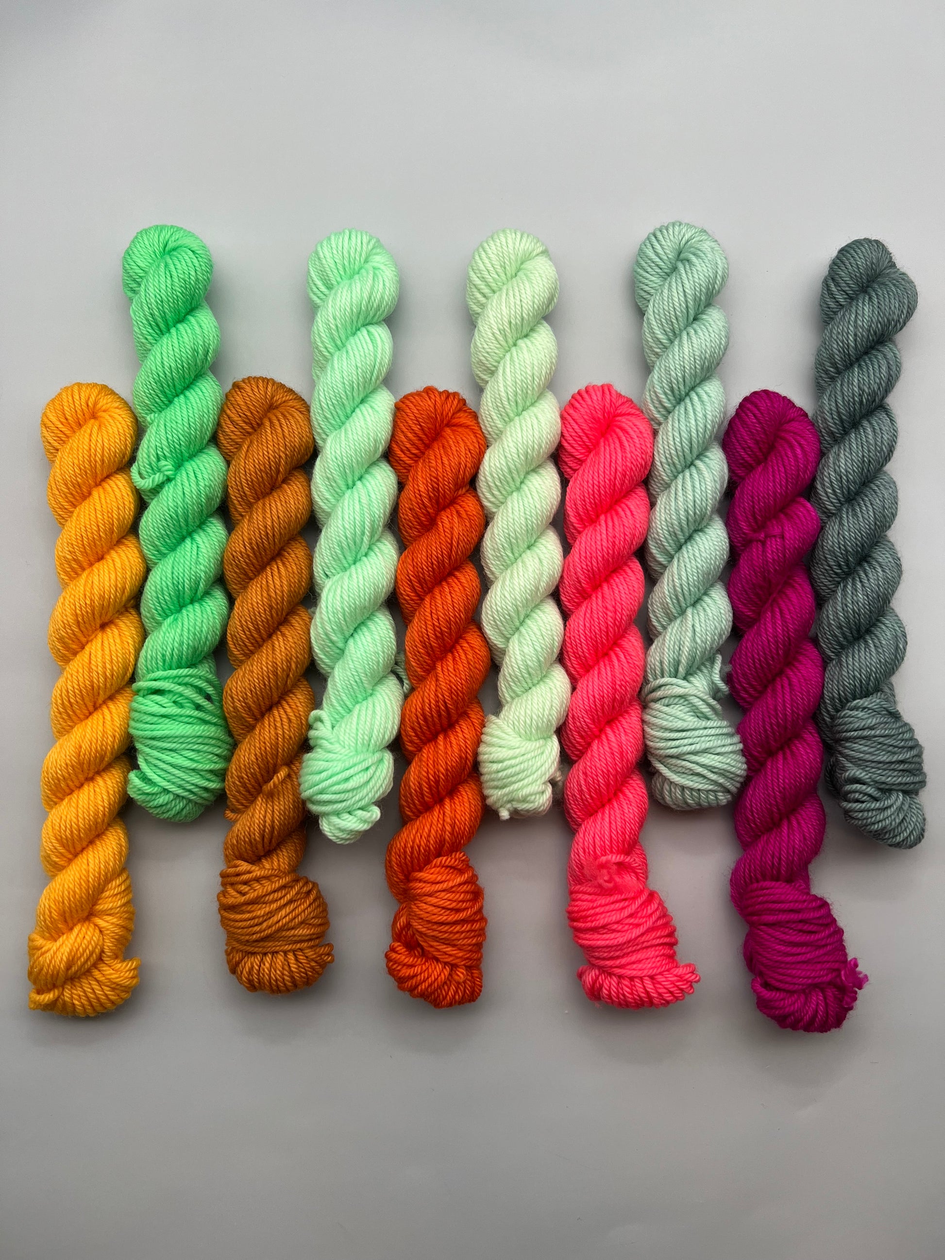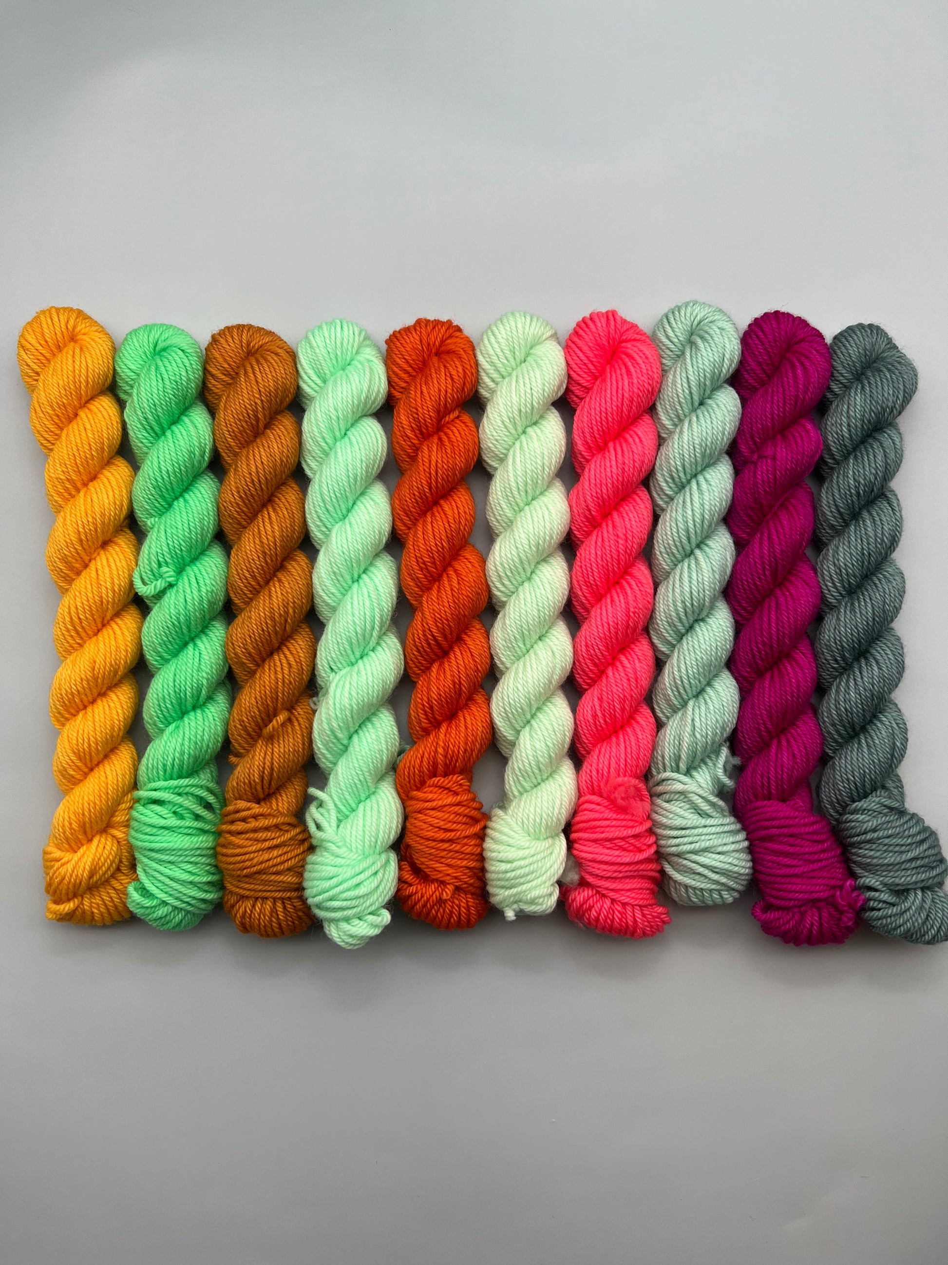 10 different 20g mini skeins. From left to right, colorways are as follows: